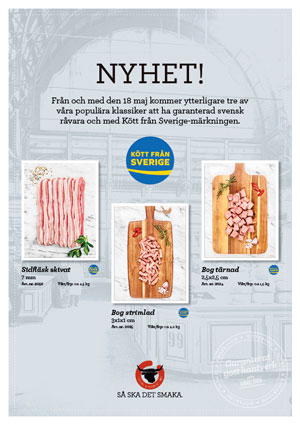 Vi fortsätter att utöka vårt sortiment med Kött från Sverige-märkningen med garanterad svensk råvara. Från den 18/5 har sortimentslistan du kan ladda ner här många av våra omtyckta klassiker Kött från Sverige-märkningen. Sortimentet utökas och fylls på löpande.